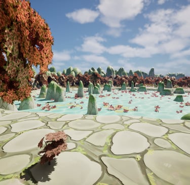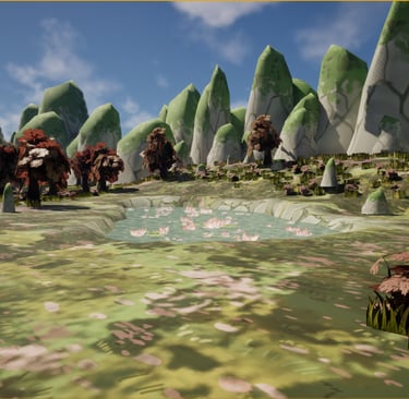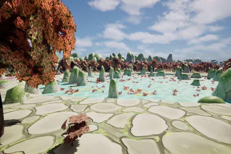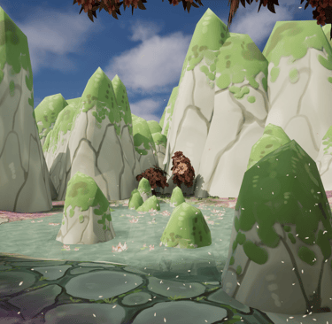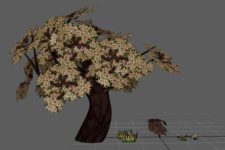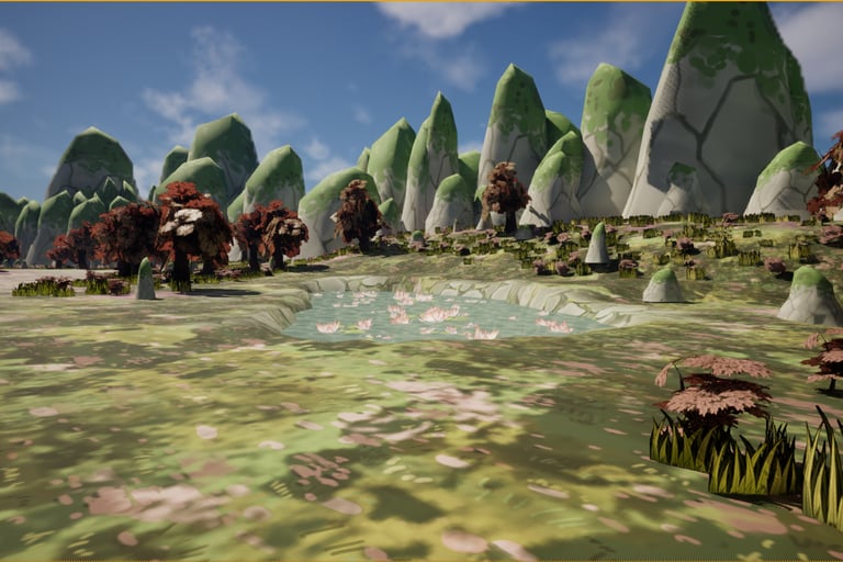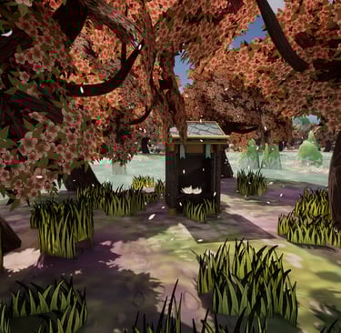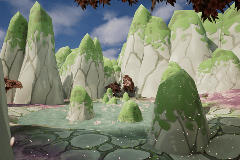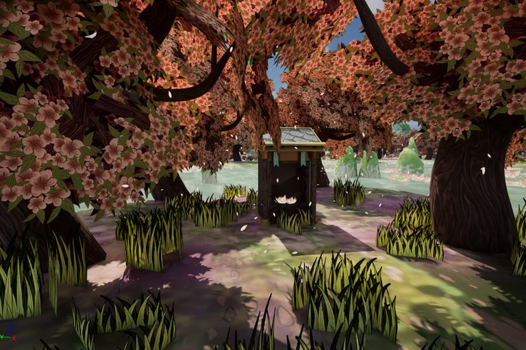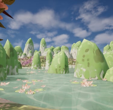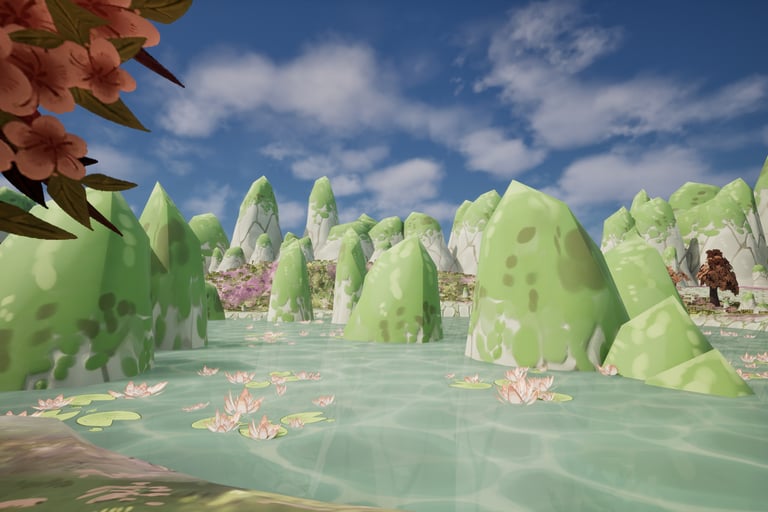 This is an environment made inspired by aesthetics of my personal taste. I love soft colors and environments that use plants such as blossoming trees and water lilies, so I wanted to make one utilizing these plants and inspired by places I've been to such as China and Singapore.